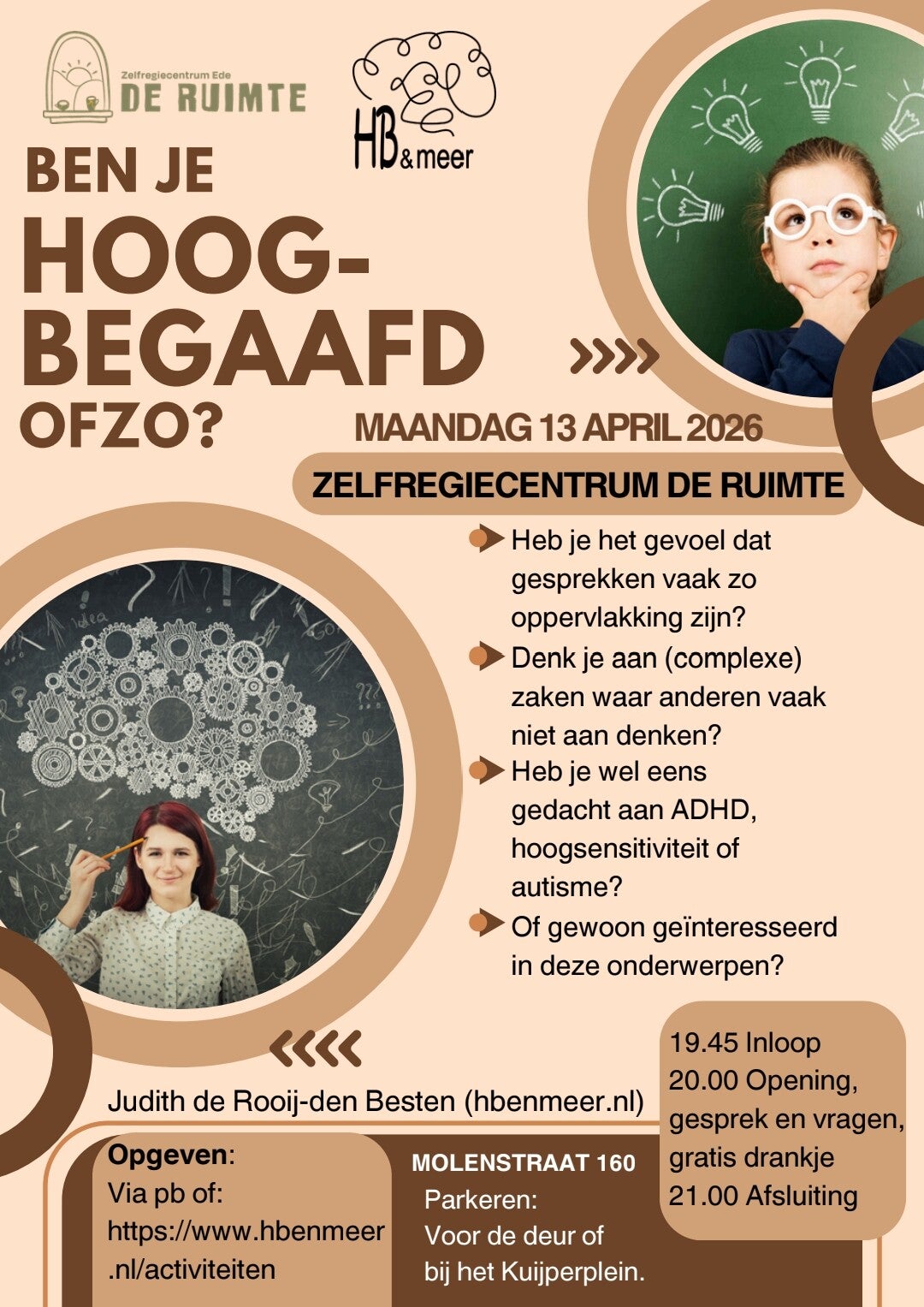 Als je regelmatig het gevoel hebt dat je op een andere manier denkt dan de mensen om je heen, kan contact met anderen die dat gevoel herkennen heel prettig zijn. Bij Zelfregiecentrum de Ruimte is er ruimte voor gesprek, vragen, twijfels, of om bijvoorbeeld te discussiëren over stellingen en ik ben er ook om vragen te stellen over neurodiversiteit.